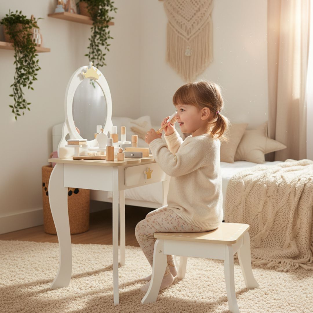 Stwórz dla niej kącik, w którym poczuje się wyjątkowo. Toaletka Lussori to bezpieczna przestrzeń do naśladowania mamy i odkrywania własnego stylu. Złote detale, motyw korony i drewniane akcesoria sprawią, że poranne przygotowania staną się Waszym ulubionym, wspólnym rytuałem.